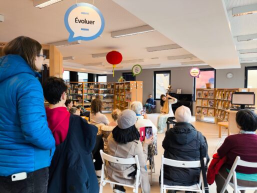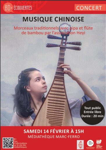Le samedi 14 février à 15h, dans le hall de la Médiathèque Marc Ferro, un court concert de musique traditionnelle chinoise a attiré de nombreux visiteurs venus s’arrêter pour écouter. Sébastien Paret et sa fille Anaïs ont interprété plusieurs pièces au dizi (flûte chinoise) et au pipa (luth chinois), offrant au public leurs vœux musicaux pour le Nouvel An. Les sonorités claires de la flûte et le timbre vibrant du pipa ont résonné dans la médiathèque, invitant les auditeurs à un voyage musical vers l’Orient. Bien que le concert n’ait duré qu’une vingtaine de minutes, l’accueil du public fut très chaleureux et beaucoup auraient souhaité que la musique continue encore un peu.